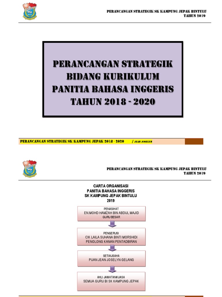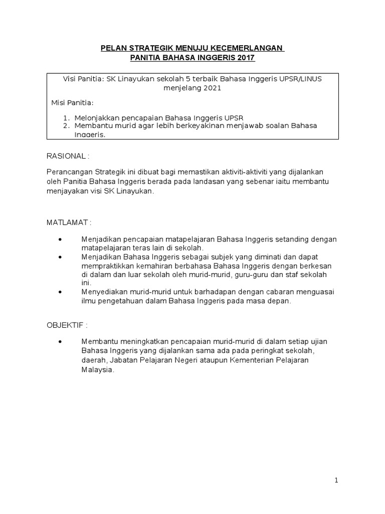 Pen?apaian murid dalam kokuria bahasa inggeris perlu dipertingkatkan. Kurikulum dan pentaksiran profesiensi bahasa kualiti sekolah kualiti guru kualiti pengetua/guru besar. Tujuan • mempertingkatkan pengurusan dan pentadbiran unit kurikulum, hal ehwal murid (hem) dan unit kokurikulum. Dengan kata lain, pengurusan strategik merupakan aktiviti merancang, mengelola, memimpin dan mengawal yang disusun secara kemas dan teratur bagi mencapai matlamat sesebuah organisasi. Pelan strategik persatuan bahasa inggeris 2013 uploaded by muhammad shamiezy sam. Bahan pelan pembangunan pendidikan malaysia 1. (ts1) (ts1) (ts1) (ts2) (ts2). Ømengikuti kursus online bersama intan (e. Perancangan strategik panitia bahasa inggeris 2014. Pengawal peribadi yang paling waspada diam. Pelan strategik panitia bahasa inggeris taktikal dan operasi 2017.docx. Peningkatan pencapaian bahasa inggeris pembinaan pelan strategik bidang unit: Contoh yang diberikan bukan sahaja berguna untuk panitia bahasa inggeris sahaja malahan boleh dijadikan rujukan kepada semua panitia disekolah.