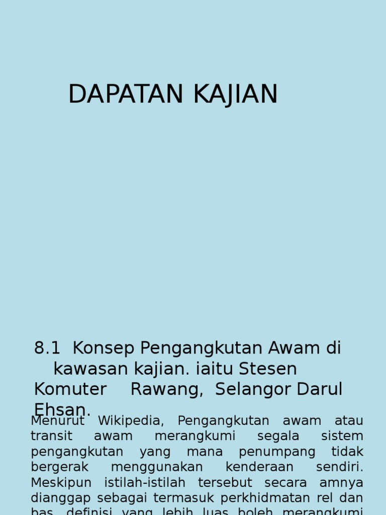1 mentakrif konsep pengangkutan awam bas di jalan belibis, taman tunku putra, kulim, kedah darul aman. Suruhanjaya pengangkutan awam darat (spad) telah menyatakan bahawa 17 hingga 18 peratus rakyat malaysia memilih pengangkutan awam sebagai mod pilihan mereka dan spad meletakkan sasaran, menjelang 2030 ia akan meningkat kepada 40 peratus. Greater kuala lumpur/wilayah lembah klang rajah 1. 8 0 dapatan kajian 8 1 konsep pengangkutan awam di bachang melaka tengah melaka for more information and source, see on this link : Pelajar dapat memberi cadangan untuk mengurangkan masalah perkembangan pengangkutan awam di kawasan kajian; Bahan grafik untuk kajian pengangkutan awam: 2 hasil kajian konsep pengangkutan awam menurut pusat rujukan persuratan melayu (kamus pelajar edisi kedua), pengangkutan awam ialah sistem pengangkutan bermotor seperti teksi, bas dan kereta api yang boleh digunakan oleh orang ramai di kawasan tertentu dengan kadar tambang yang telah ditetapkan. Mengkaji keberkesanan (od) laluan bas smart selangor di daerah sepang. Namun begitu, masih banyak kelemahan yang kerap menjadi sungutan orang ramai. Format kerja kursus geografi 2013. Antara bahan grafik yang boleh digunakan ialah jadual, graf, carta pai, peta minda dan peta aliran. Objektif kajian geografi pengangkutan awam. Pengangkutan awam merupakan salah satu pengangkutan yang amat penting di negara kita.